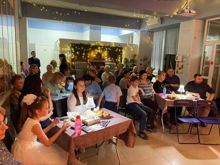 А вечером в субботу атмосферно и динамично прошел праздник, посвященный мамам. Зал семейно-досугового центра был полон – на мероприятие пришли школьники семейной школы «Логос» со своими родителями, члены общины и их знакомые и родственники. Удобно разместившись за столиками, пришедшие участвовали в викторине, мастер-классе по приготовлению здоровой еды, дискуссии на тему: «Современная женщина: кто она?». Ученики выступили перед публикой, и в конце программы на память взрослые получили брошюру со стихами и календари, а дети – детскую христианскую книгу.